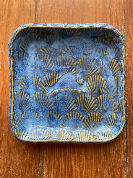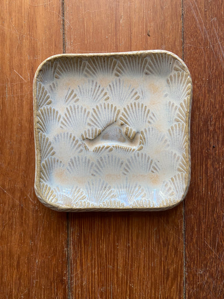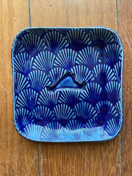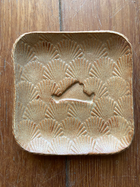 These sweet little trays are embossed with the map of Martha’s Vineyard set in a background of scallop shells. Available in several glaze colors , each one is unique. Patterns and colors vary. Currently available in Sand,cobalt, cream, Sapphire